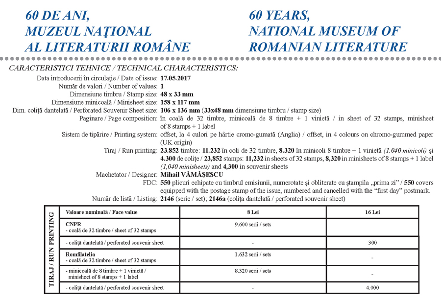 Romfilatelia mulţumeşte Muzeului Naţional al Literaturii Române pentru sprijinul documentar acordat la realizarea acestei emisiuni de mărci poştale.