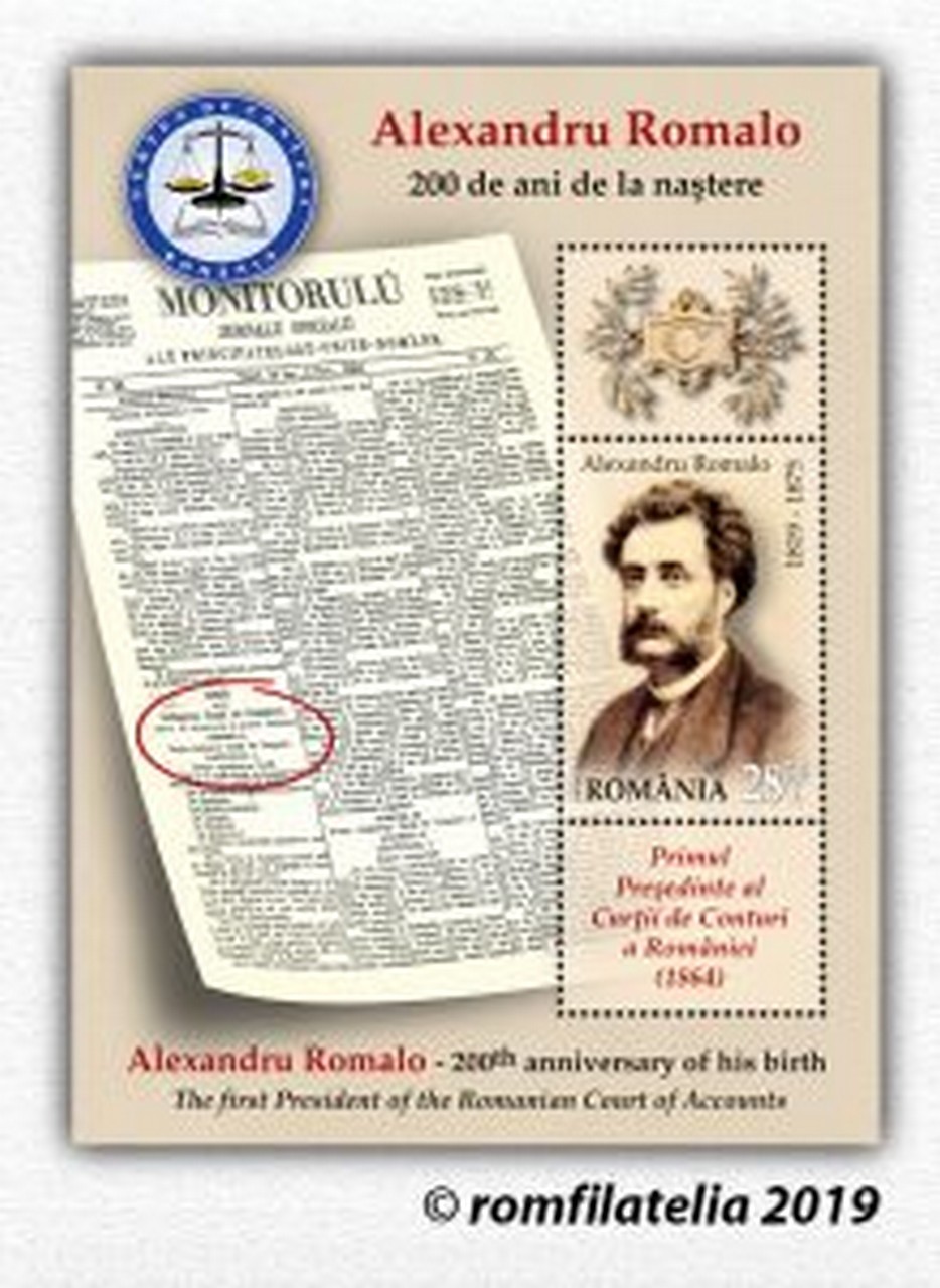 Romfilatelia introduce în circulație la data de marți, 7 mai 2019, o emisiune aniversară de mărci poștale sub denumirea Alexandru Romalo, 200 de ani de la naștere, materializată sub forma unei colițe filatelice dantelate cu o marcă poștală a cărei valoare nominală este de 28,50 lei. Grafica alăturată imaginii mărcii poștale ilustrează în facsimil prima pagină a „Monitorului Oficial”, în care a fost publicată legea înființării Curții de Conturi a României și sigla actuală a acestei instituții.