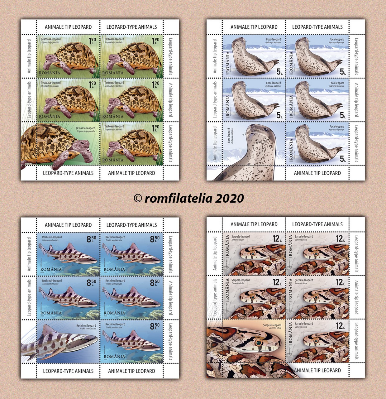 Romfilatelia introduce în circulație joi, 2 iulie 2020, emisiunea de mărci poștale Animale tip leopard, o tematică în premieră dedicată Faunei.