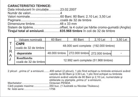 Nicolae Titulescu (1882-1941), ilustrat pe timbrul cu valoarea nominalã de 3,50 Lei, a fost un renumit om politic şi diplomat român. Strãlucit orator, a devenit academician în 1935. Este socotit ca fiind unul dintre cei mai mari diplomaţi europeni din perioada interbelicã. A fost Ministru de Externe al României între anii 1927-1928 şi 1932-1936. Între 1920 şi 1936 a fost delegat permanent al României la Liga Naţiunilor al cãrui Preşedinte a fost ales de douã ori consecutiv în 1930 şi 1931. A dus o activitate diplomaticã intensã pentru întãrirea securitãţii şi integritãţii teritoriale a României. A fost îndepãrtat din guvern de cãtre regele Carol I şi a emigrat în Franţa, unde a şi murit. „Acest ministru al unei ţãri mici face o politicã în stil mare. În politica externã e îmbarcat pe o firavã luntrişoarã pe care o conduce ca pe un vapor mare, în politica internã stã cãlare pe o scândurã putrezitã, cãreia pânã la urmã îi dã o stabilitate de stâncã“ spunea despre acest ilustru „ministru al Europei“, cum a fost el denumit de presa vremii, Edouard Herriot, prim ministru al Franţei, una dintre personalitãţile de prim rang ale celei de-a treia Republici Franceze.