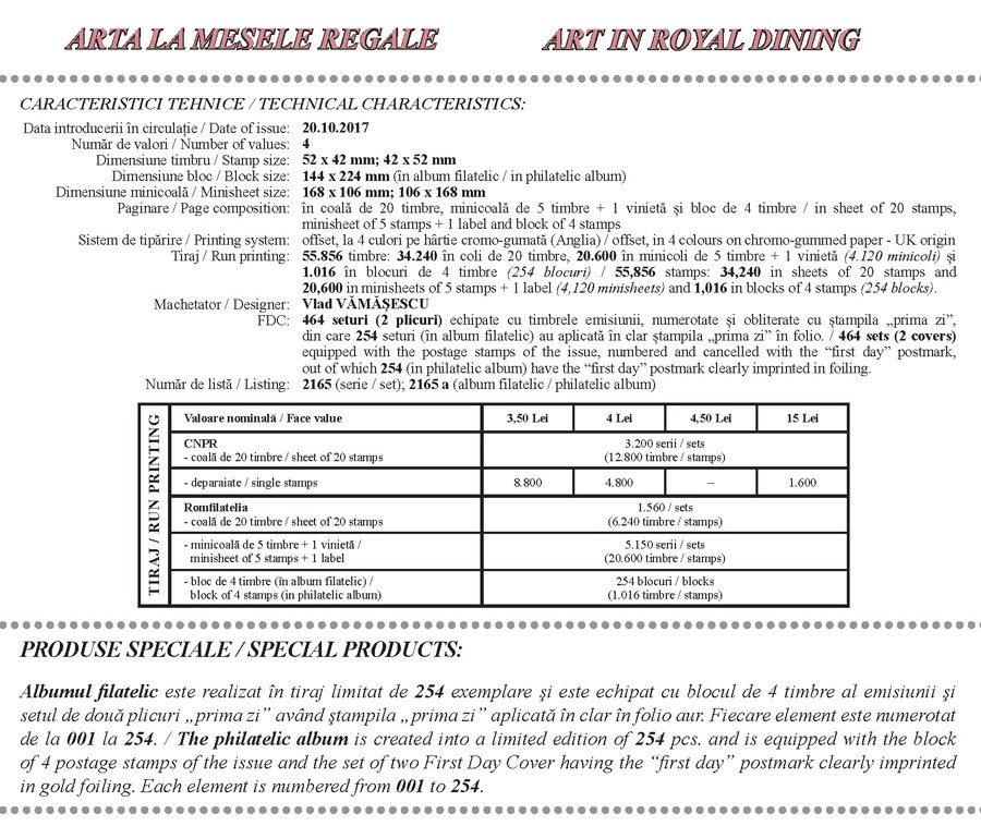 Romfilatelia introduce în circulație, în data de 20 octombrie, emisiunea de timbre poștale „Arta la mesele regale”, o emisiune ce aduce în atenția colecționarilor bogăția și fastul meselor de altădată.