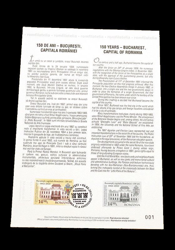 Carton filatelic 150 DE ANI – BUCUREŞTI, CAPITALA ROMÂNIEI – Romfilatelia-O lume intr-un timbru