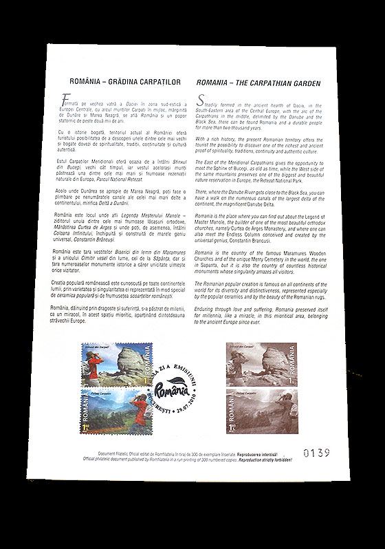 Carton filatelic ROMÂNIA –GRÃDINA CARPAȚILORCarton filatelic ROMÂNIA –GRÃDINA CARPAȚILOR