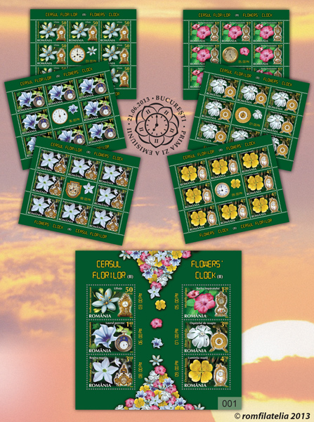 Fiecare floare, în funcţie de specia cãreia îi aparţine şi de zona geograficã în care creşte, are o anumitã orã când se descoperã privirii luminii, naturii şi oamenilor. Acestã frumoasã particularitate a florilor este ilustratã în cele 12 timbre ale emisiunii Ceasul florilor, realizatã din douã pãrţi. Fiecãrei flori îi este asociat un ceas, exponat din colecţia Muzeului Ceasului „Nicolae Simache” din Ploieşti, care indicã ora înfloririi acesteia.