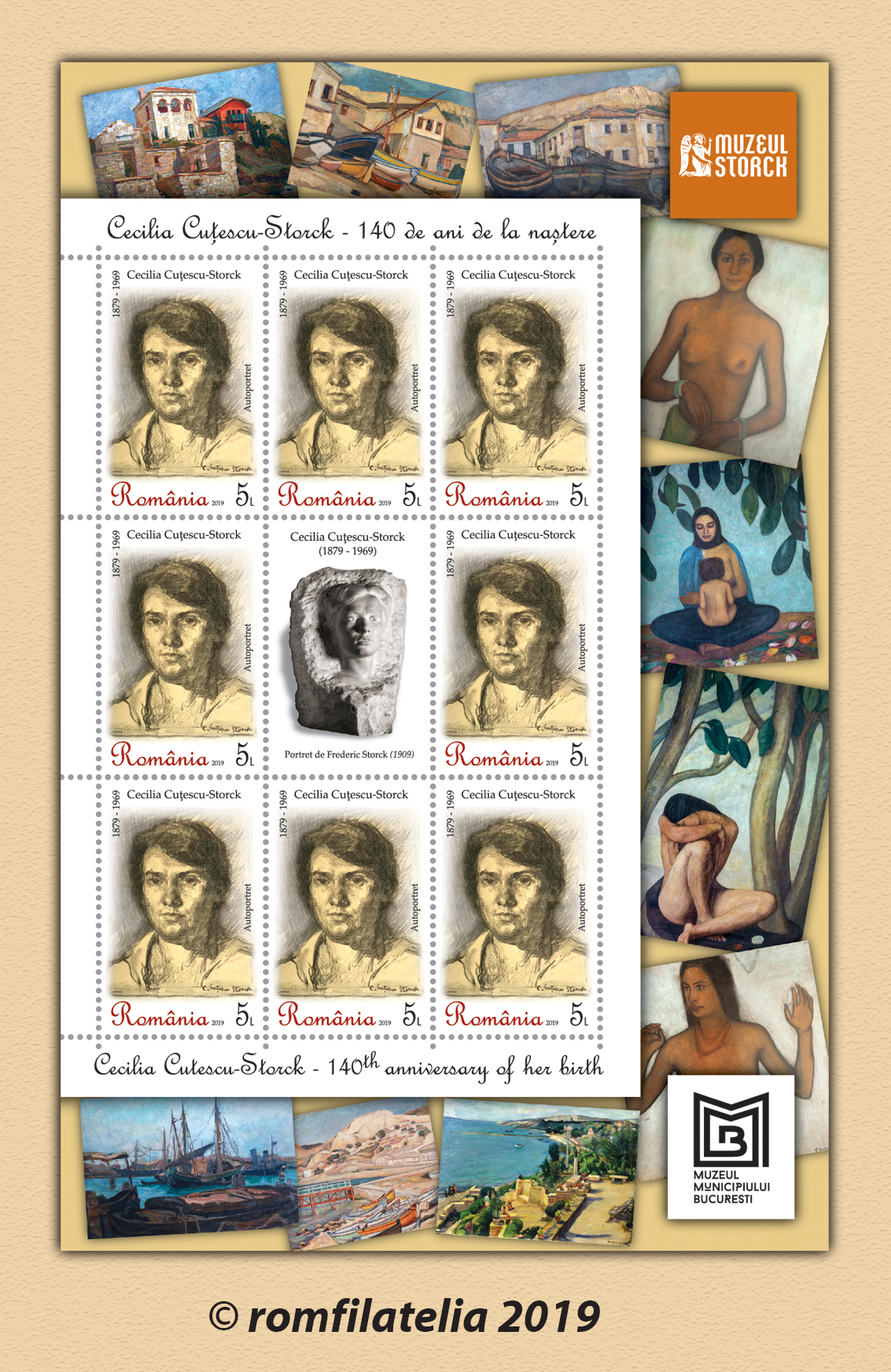 Emisiunea de mărci poștale Cecilia Cuțescu-Storck, 140 de ani de la naștere, pe care Romfilatelia o introduce în circulație, joi, 14 martie a.c., este dedicată celebrării vieții și personalității primei profesoare de arte decorative din România, remarcată și ca prima femeie profesor la o universitate de artă de stat din Europa.