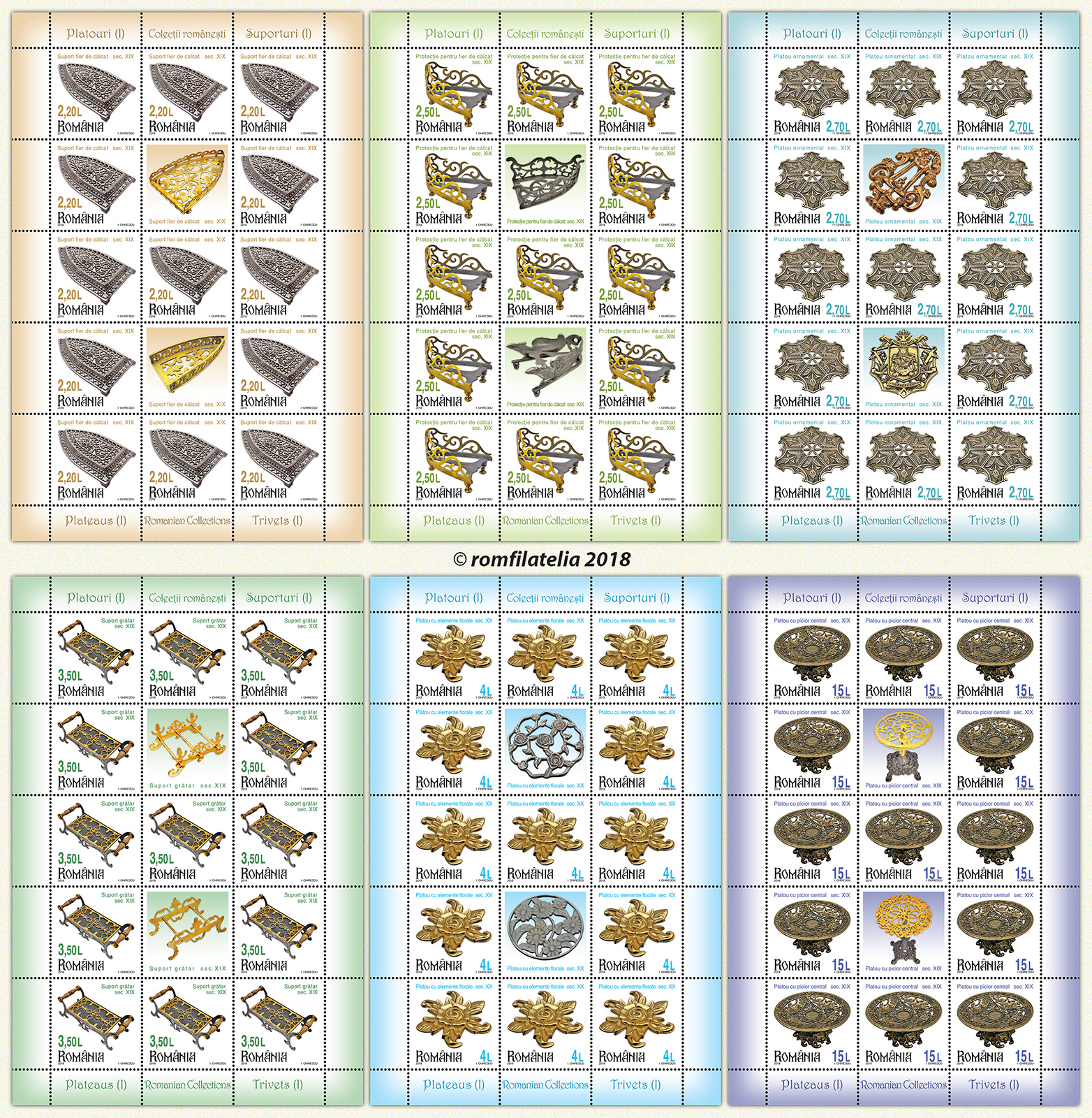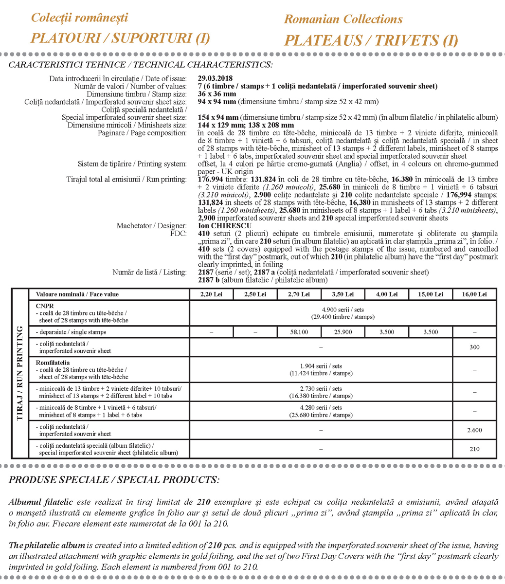 Romfilatelia continuă seria emisiunilor de mărci poștale Colecții românești, de această dată cu tematica Platouri / Suporturi (I). Emisiunea este alcătuită din șase timbre și o coliță nedantelată, pe care sunt reprezentate trivete, denumire generică pentru a desemna suporturile cu mai mult de trei picioare, precum și pe cele cu un picior și cu o bază, din secolele XIX-XX. Exponatele aparțin unei renumite colecții din București, cea mai mare din lume, certificată de Guiness World Records, în 2016.