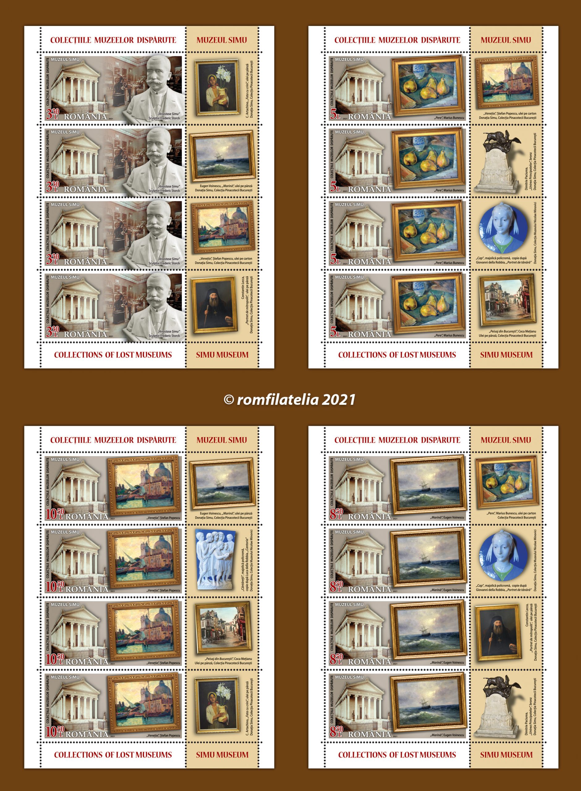 Romfilatelia continuă seria de tematici dedicate artei și colecționarilor, introducând în circulație o emisiune de mărci poștale cu o tematică inedită, Colecțiile muzeelor dispărute, dedicată recuperării memoriei unui muzeu odinioară foarte cunoscut și apreciat în București: Muzeul Simu.