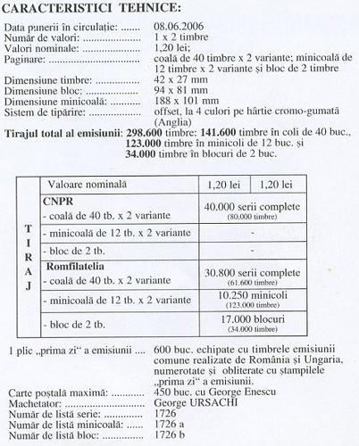 Cu ocazia împlinirii a 60 de ani de la reluarea relaţiilor diplomatice dintre România şi Ungaria, Romfilatelia introduce în circulaţie, emisiunea de timbre comunã româno-ungarã, Compozitori Celebri (George Enescu – 1881- 1955 şi Béla Bartók – 1881-1945).