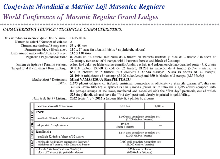 Cu ocazia desfãşurãrii în acest an la Bucureşti, în perioada14-17 mai a Conferinţei Mondiale a Marilor Loji Masonice Regulare, Romfilatelia introduce în circulaţie emisiunea de mãrci poştale dedicatã acestui eveniment.