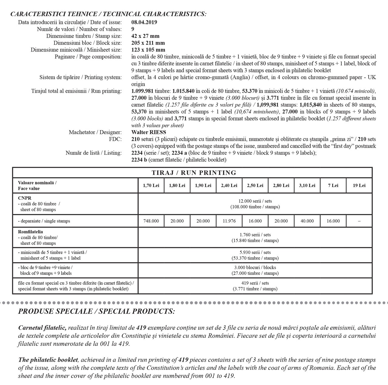 Având drept obiectiv o tematică în premieră legată de Constituţia României, secţiunea drepturilor și libertăților fundamentale, Romfilatelia introduce în circulație, luni, 8 aprilie a.c., emisiunea de mărci poștale „Constituția României, garant al drepturilor cetățenilor români”.