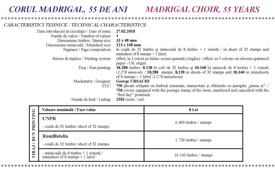 CORUL MADRIGAL, 55 DE ANI – Romfilatelia-O lume intr-un timbru