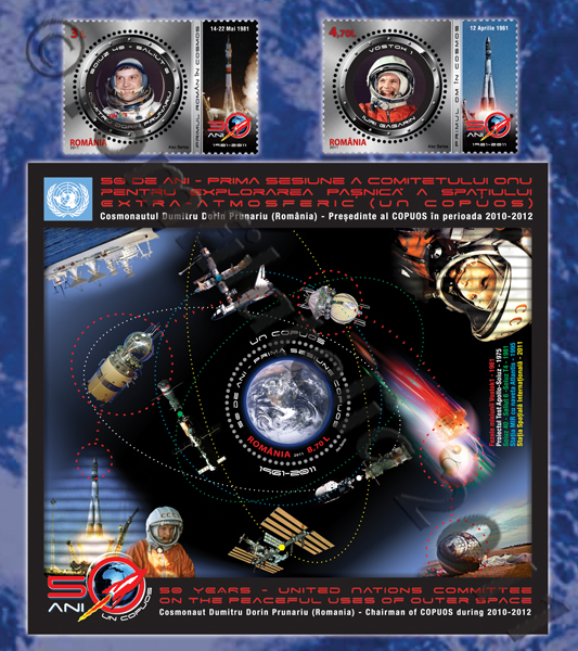 Cu ocazia împlinirii a 50 de ani de la zborul primului om în Cosmos (Iuri Gagarin), a 30 de ani de la zborul primului român în Cosmos (Dumitru Dorin Prunariu) şi a 50 de ani de la prima sesiunea COPUOS (Comitetul ONU pentru Utilizarea Paşnicã a Spaţiului Extra-atmosferic), Romfilatelia introduce în circulaţie emisiunea de mãrci poştale intitulatã COSMOS 2011.
