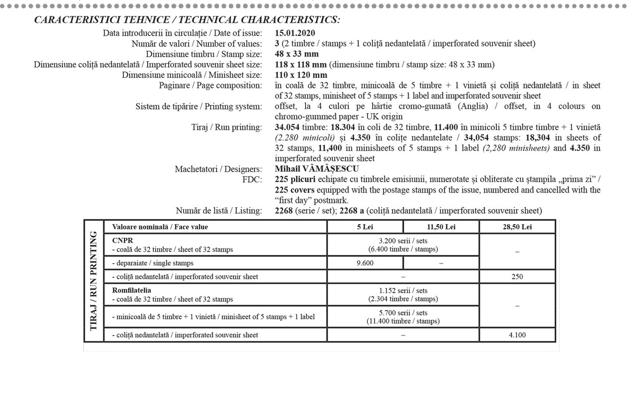 Pe colița nedantelată a emisiunii, cu valoarea nominală de 28,50 lei, se regăsește timbrul ce ilustrează ambele jumătăți ale acestei romantice iubiri împreună cu poezia „Dormi” de Mihai Eminescu și o ilustrație simbol a celor doi îndrăgostiți realizată de Ligia Macovei.
