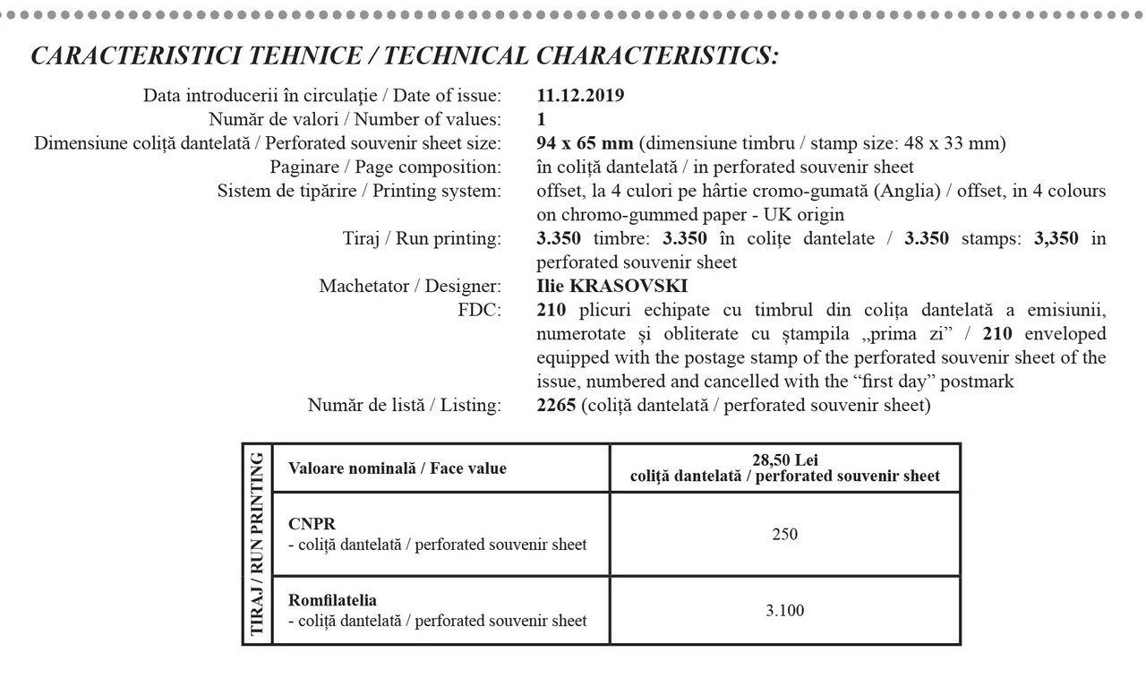 Conceptul coliței dantelate, cu valoarea nominală de 28,50 lei se bazează pe evidențierea formelor geometrice primare care compun logo-ul DESIGN 50. Este o viziune care integrează elemente plastice folosite în toate ramurile designului. Culorile folosite, exprimă bucuria prilejuită de aniversarea a 50 de ani de învățământ de design românesc. Elementele grafice ce încadrează timbrul, sunt specifice unor teme de basic design.