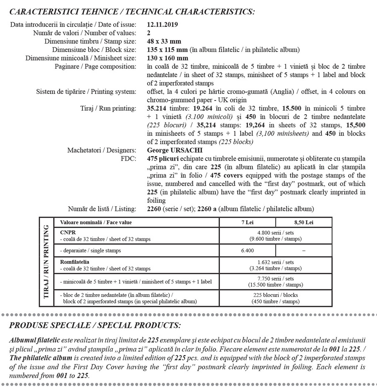 Albumul filateliceste realizat în tiraj limitat de 225 exemplare şi este echipat cu blocul de 2 timbre nedantelate al emisiunii şi plicul „prima zi” având ştampila „prima zi” aplicată în clar în folio. Fiecare element este numerotat de la 001 la 225.