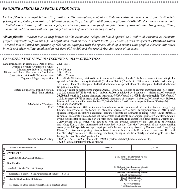 Asumându-şi rolul de promotor al valorilor culturale naţionale şi internaţionale, al tradiţiilor, Romfilatelia introduce în circulaţie emisiunea comunã de mãrci poştale România – Hong Kong, China: Artã popularã tradiţionalã (Ouã încondeiate şi figurine din orez).