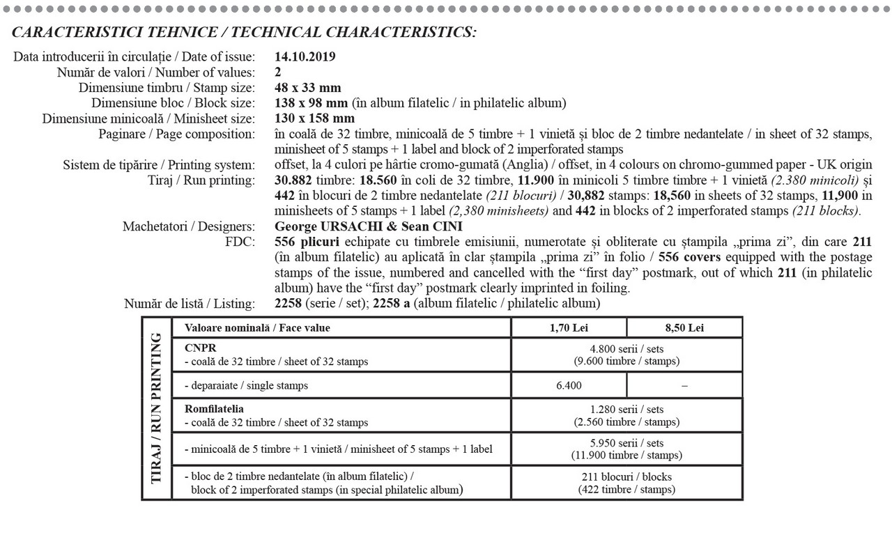 Albumul filatelic este realizat în tiraj limitat de 211 exemplare şi este echipat cu blocul de 2 timbre nedantelate al emisiunii şi plicul „prima zi” având ştampila „prima zi” aplicată în clar în folio. Fiecare element este numerotat de la 001 la 211.