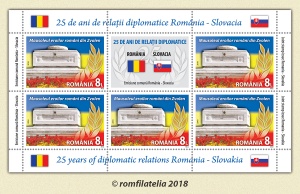 Romfilatelia introduce în circulație emisiunea comună de mărci poștale România-Slovacia, 25 de ani de relații diplomatice. Timbrul, cu valoarea nominală de 8 lei, ilustrează Cimitirul Militar Român de la Zvolen.