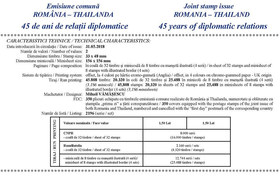 Emisiune comună ROMÂNIA – THAILANDA: 45 de ani de relaţii diplomatice – Romfilatelia-O lume intr-un timbru