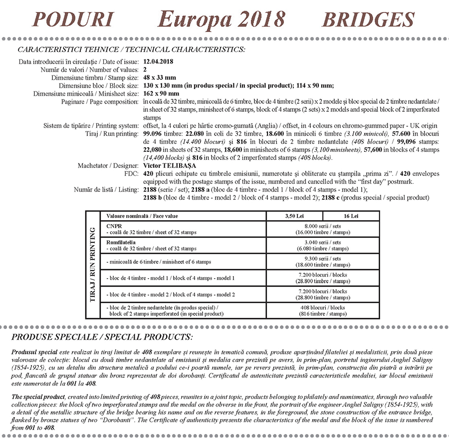 Sub genericul Europa 2018, Romfilatelia introduce în circulație emisiunea de mărci poștale Poduri, tematică selectată pentru acest an de către PostEurop, organism al Uniunii Poștale Universale, agenție specializată a Organizației Națiunilor Unite.