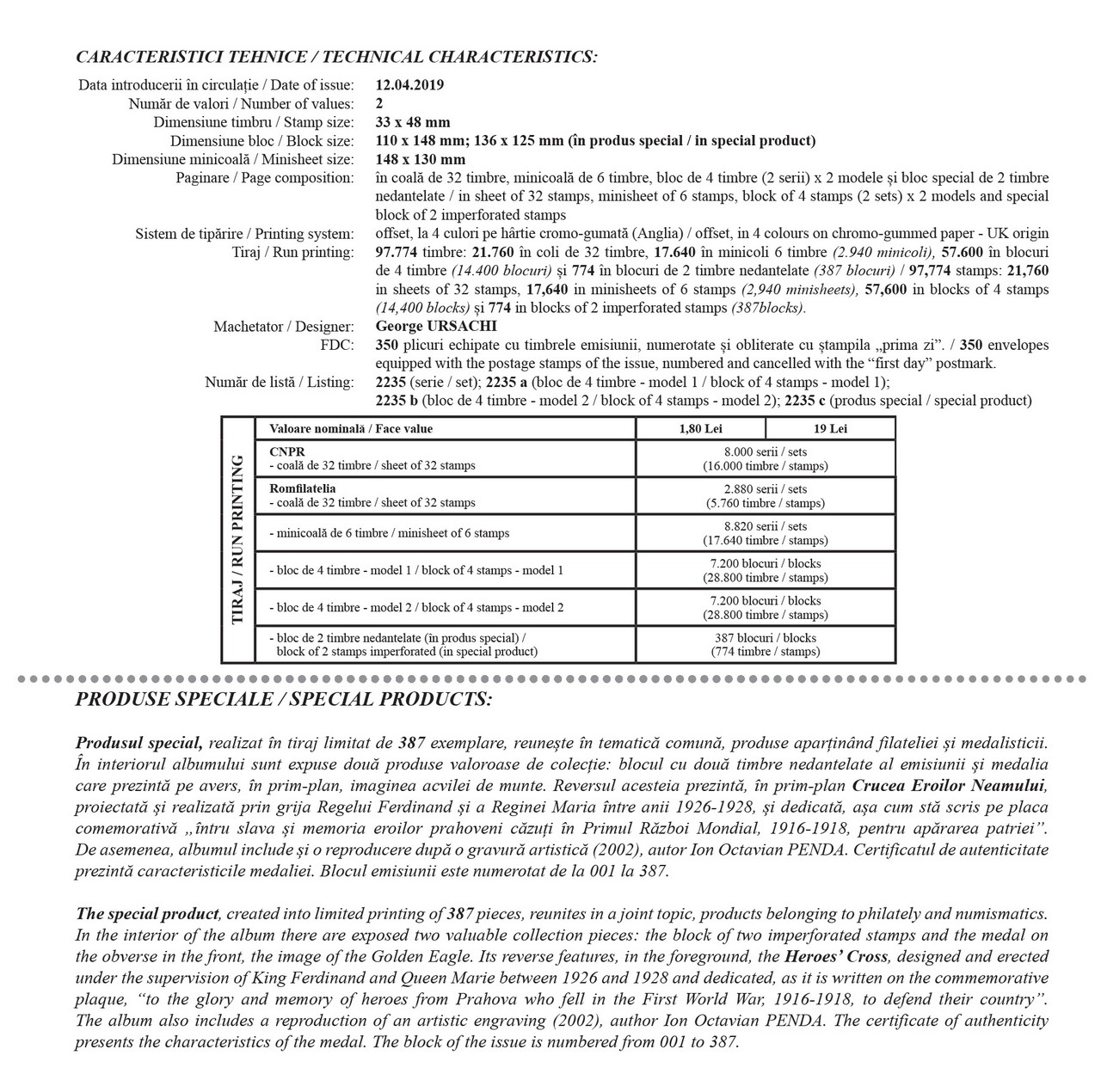 În plus, emisiunea este completată cu un produs filatelic special, cu medalie. Aversul medaliei redă în prim-plan, imaginea acvilei de munte. Reversul acesteia prezintă, în prim-plan Crucea Eroilor Neamului, proiectată și realizată prin grija Regelui Ferdinand și a Reginei Maria între anii 1926-1928, și dedicată, așa cum stă scris pe placa comemorativă „întru slava și memoria eroilor prahoveni căzuți în Primul Război Mondial, 1916-1918, pentru apărarea patriei”.