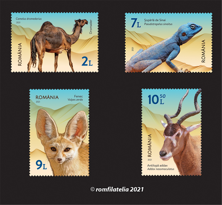 Romfilatelia introduce în circulație, joi, 12 august 2021, o emisiune de mărci poștale cu o tematică abordată în premieră: Fauna deșertului.