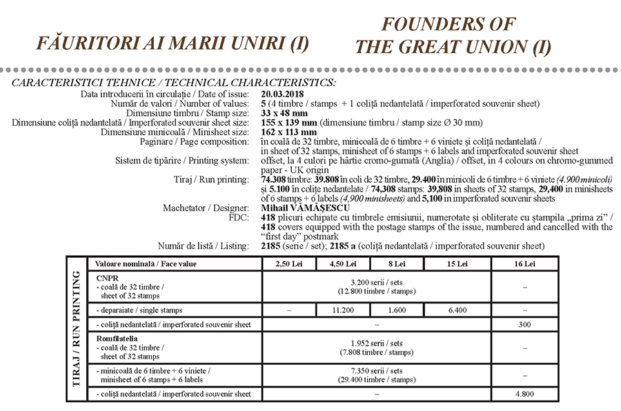 Pe timbrul cu valoarea nominală de 2,50 lei este ilustrat Miron Cristea, primul Patriarh al Bisericii Ortodoxe Române. Portretul Cardinalului Iuliu Hossu, episcop greco-catolic, este reprodus pe timbrul cu valoarea nominală de 4,50 lei. Pe timbrul cu valoarea nominală de 8 lei este reliefat portretul lui Iuliu Maniu, luptător pentru cauza națională a românilor din Transilvania. Portretul lui Ion I.C. Brătianu, prim-ministru în perioada Primului Război Mondial, este redat pe timbrul cu valoarea nominală de 15 lei. Pe colița  nedantelată a emisiunii de mărci poștale, cu valoarea nominală de 16 lei, este ilustrat Regele Ferdinand I, alături de alți făuritori ai Marii Uniri: Take Ionescu, Alexandru Vaida-Voevod, Constantin Stere, Samoilă Mârza, Gheorghe Pop de Băsești, Sextil Pușcariu, Iancu Flondor și Ion Nistor, iar pe timbrul coliței este reprodusă stema României mici, care avea reprezentate pe scut teritoriile cuprinse în granițele țării până în 1918.