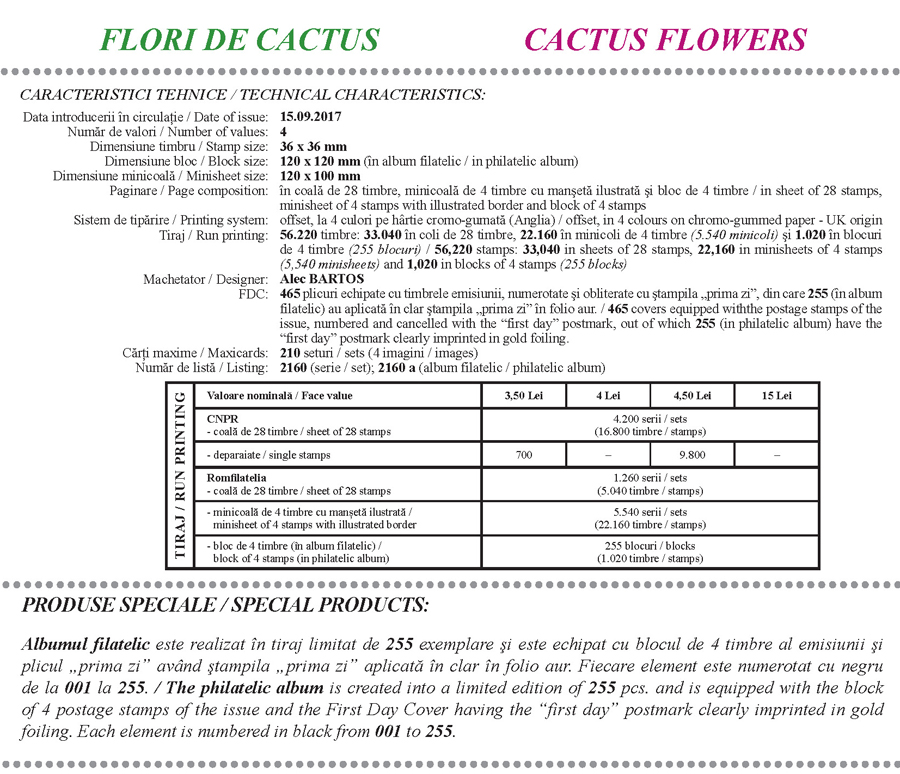 Romfilatelia vine în întâmpinarea pasionaţilor de floră, prin introducerea în circulaţie a emisiunii de mărci poștale FLORI DE CACTUS.