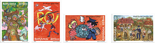 – timbrul cu valoarea nominală de 1 Leu ilustrează un desen intitulat “Vești bune pentru toți“ realizat de Adina Elena Mocanu din Valea Cireșului (jud. Argeș).
