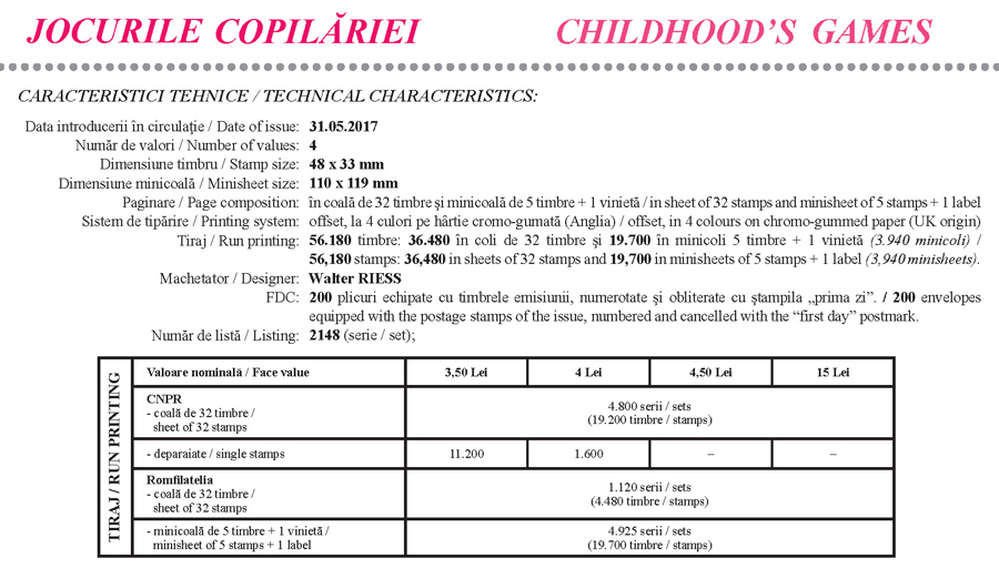 Prima vârstă a omului, copilăria, este asociată cu trăirea  într-o atmosferă a jocului, de aceea, Romfilatelia prezintă prin cele 4 timbre ale emisiunii dedicate zilei de 1 Iunie, o călătorie în timp, către JOCURILE COPILĂRIEI.