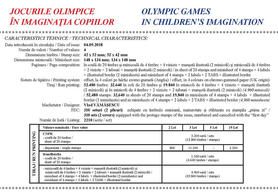 Romfilatelia susține și promovează spiritul olimpic și valorile Olimpismului în rândul tinerelor talente din mediul școlar prin introducerea în circulaţie a emisiunii de mărci poștale Jocurile Olimpice în imaginaţia copiilor.