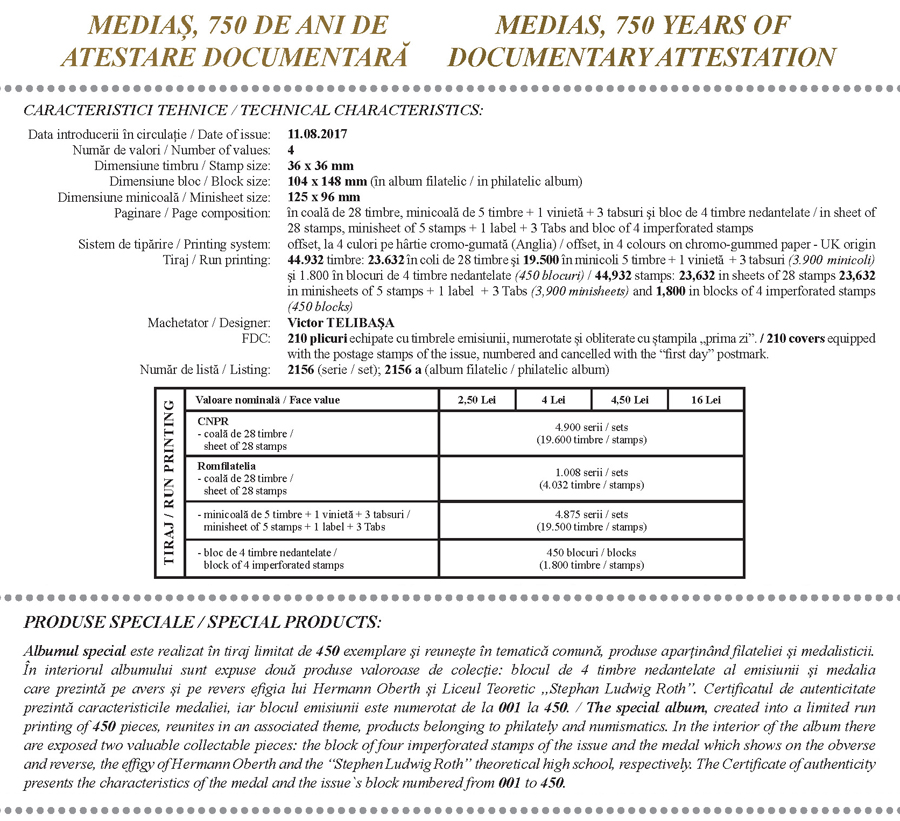Romfilatelia mulţumește Primăriei Municipiului Mediaș şi dlui. ing. Liviu Pintican-Juga pentru sprijinul documentar acordat la realizarea acestei emisiuni de mărci poștale.