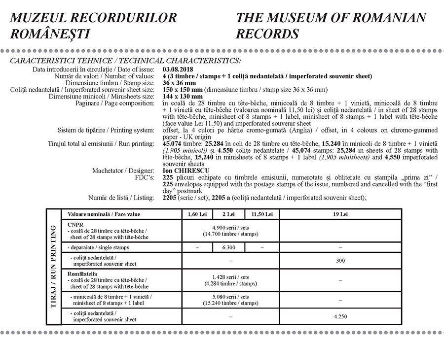 Pentru a onora inițiativele culturale independente, Romfilatelia introduce în circulație emisiunea de mărci poștale Muzeul Recordurilor Românești, dedicată unei instituții care impresionează prin valoarea şi diversitatea exponatelor. Pe primul timbru al emisiunii, cu valoarea nominală de 1,60 lei, este reprodusă sigla Muzeului Recordurilor Românești. Pe al doilea timbru al emisiunii, cu valoarea nominală de 2 lei, este reprodusă o marcă poștală Cap de bour (1858), cu valoarea de 81 parale, aflată în colecția muzeului. Al treilea timbru al emisiunii, cu valoarea nominală de 11,50 lei, ilustrează sigla Federației Internaționale a Filateliei (F.I.P.). Colița nedantelată a emisiunii, cu valoarea nominală de 19 lei, este alcătuită dintr-un timbru care reproduce sigla muzeului, alături de exponate din colecțiile instituției.