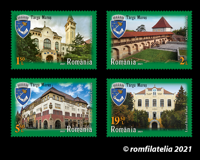 Romfilatelia introduce în circulație, vineri, 3 septembrie 2021, o nouă emisiune de mărci poștale dedicată tezaurului arhitectonic urban al României: Orașele României, Târgu Mureș.