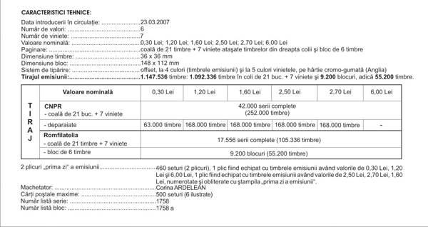 Pentru promovarea eficientă a marelui eveniment filatelic Expoziţia Filatelică Mondială EFIRO 2008, cele şase mărci poştale ale emisiunii au fost tipărite în coli, ce au pe coloana din dreapta viniete nedetaşabile conţinând logoul EFIRO 2008 (o variantă în limba română şi cealaltă în limba engleză). Timbrele au o latură nedantelată, comună cu cea a vinietelor şi marcată prin trei puncte de perfor.