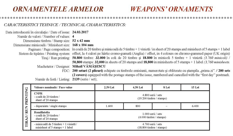 Romfilatelia introduce în circulaţie, la data de 24 martie, emisiunea de timbre poştale „Ornamentele armelor”, o emisiune ce aduce în atenţia colecţionarilor bogăţia decoraţiilor armelor de foc din secolele trecute.