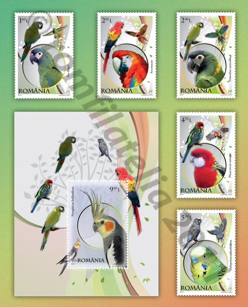 Romfilatelia introduce în circulaţie emisiunea de mãrci poştale „Papagali“, pe ale cãrei timbre sunt ilustraţi urmãtorii papagali: Peruşul ondulat, Ara stacojiu, Ara colorat, Macaul cu guler galben, Papagalul nimfã, Papagalul rozela.