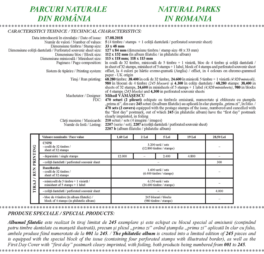 Pe timbrele emisiunii de mărci poștale sunt reproduse exemplare din flora și fauna parcului. Edraianthus graminifolius ssp. kitaibelii, o plantă cu florile de culoare albastru-violet, ilustrează timbrul cu valoarea nominală de 1,60 lei. Pe timbrul cu valoarea nominală de 2 lei este reprodusă Primula auricula ssp. serratifolia, cunoscută popular ca Urechea ursului. Testudo hermanni, sau Țestoasa bănățeană, ilustrează timbrul cu valoarea nominală de 5 lei. Rădașca, denumită științific Lucanus cervus, este reprodusă pe timbrul cu valoarea nominală de 19 lei. Pe timbrul coliței dantelate a emisiunii, cu valoarea nominală de 28,50 lei, este redat Zamenis longissimus, denumit și Șarpele lui Esculap, care, înfășurat pe un toiag, este simbolul medicinei.