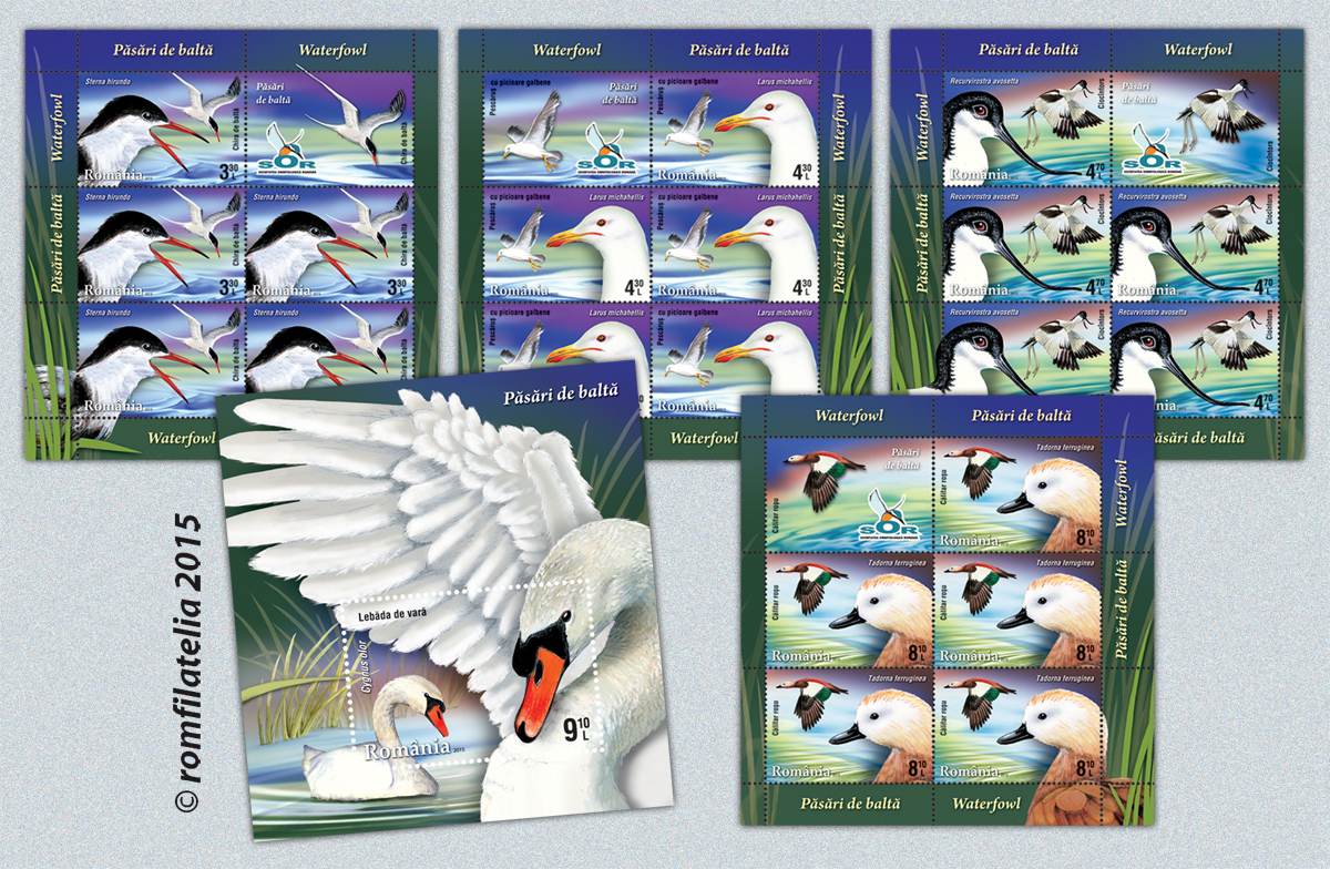 Păstrând tradiţia proiectelor filatelice dedicate faunei României, Romfilatelia realizează o nouă emisiune de mărci poştale cu tematica Păsări de baltă.