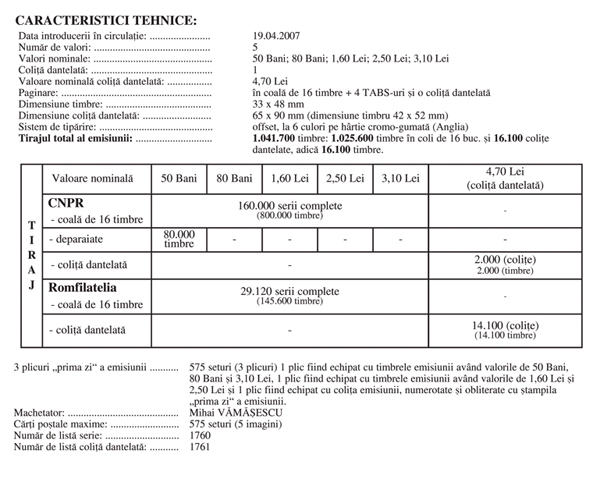 Emisiunea filatelicã a fost realizatã cu sprijinul Societãţii Ornitologice Române (SOR) a cãrei siglã este reprodusã pe manşeta coliţei dantelate şi pe TABS-urile colilor de timbre.