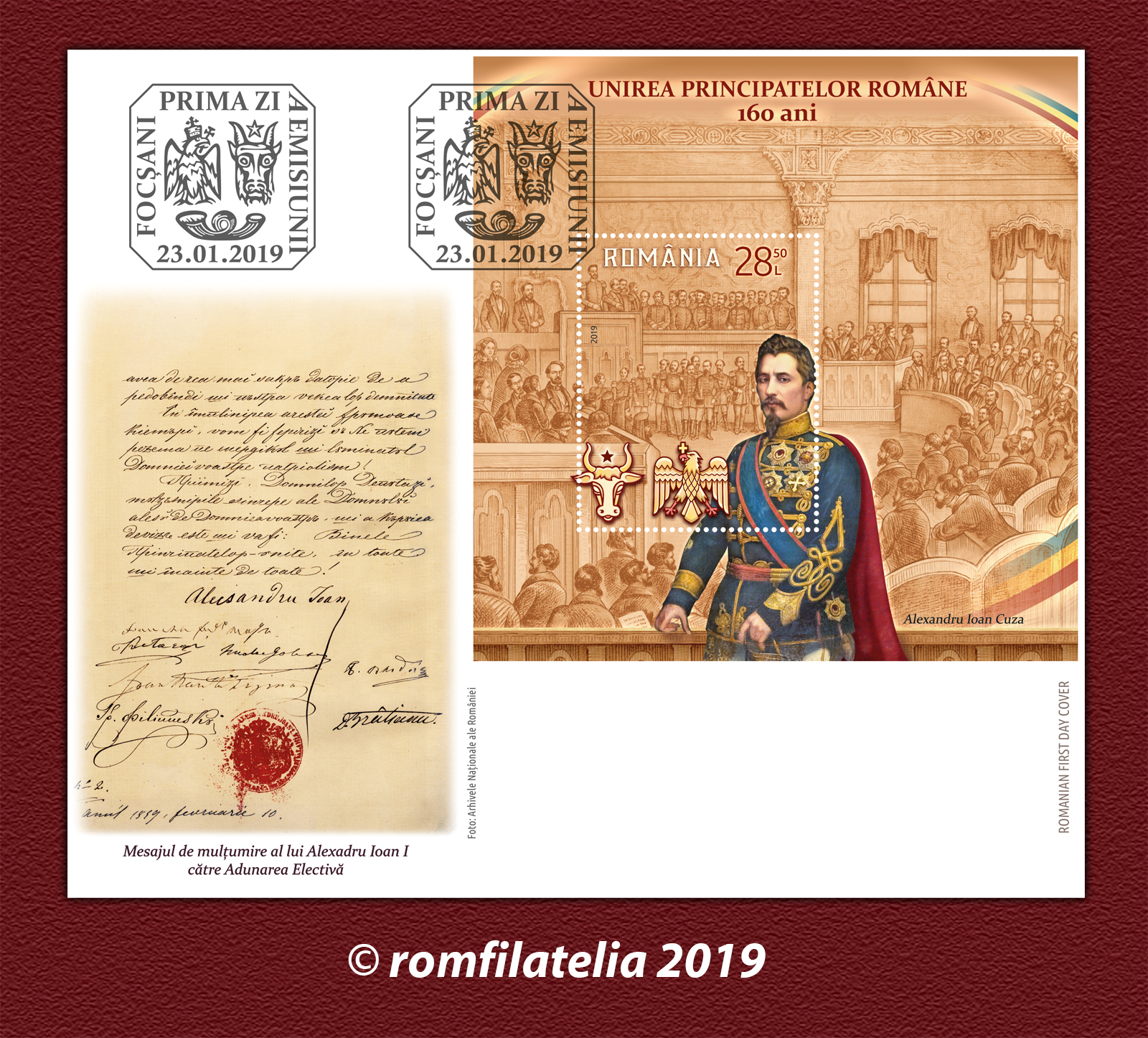 Plic prima zi UNIREA PRINCIPATELOR ROMÂNE, 160 DE ANI – Romfilatelia-O lume intr-un timbru