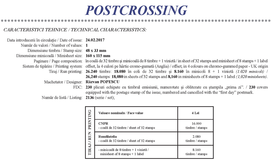 Deoarece postcrosserii nu colecţionează doar cărţile poştale ci şi timbrele ce le însoţesc, Romfilatelia, vine în întâmpinarea colecţionarilor prin timbrul emisiunii dedicat acestei pasiuni numită Postcrossing.