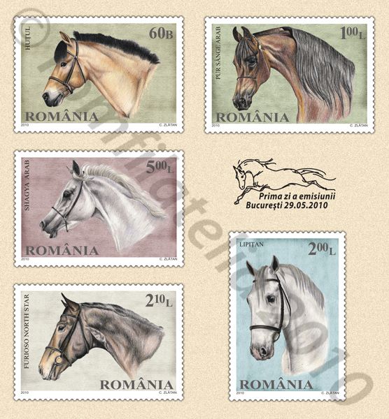 Venind în sprijinul colecţionarilor de timbre şi al iubitorilor de cai, Romfilatelia introduce în circulaţie emisiunea de mãrci poştale „Rase de cai“.