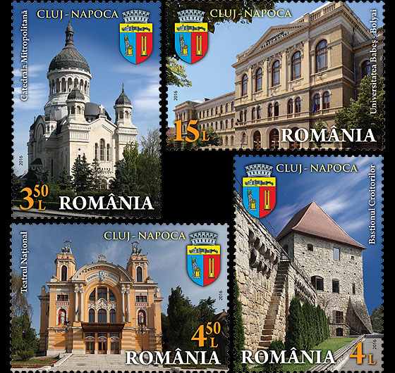 Set 4 valori ORAȘELE ROMÂNIEI, CLUJ-NAPOCA – Romfilatelia-O lume intr-un timbru