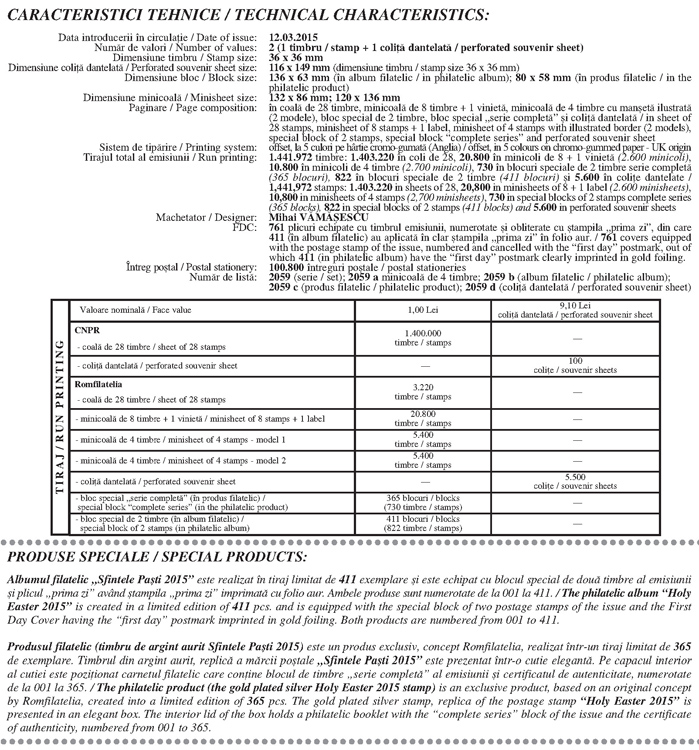 În apropierea celei mai mari Sărbători creştine, Romfilatelia prezintă emisiunea de mărci poştale Sfintele Paşti 2015 ce rememorează două momente de cea mai mare importanţă din viaţa lui Iisus Hristos: Răstignirea şi Învierea.
