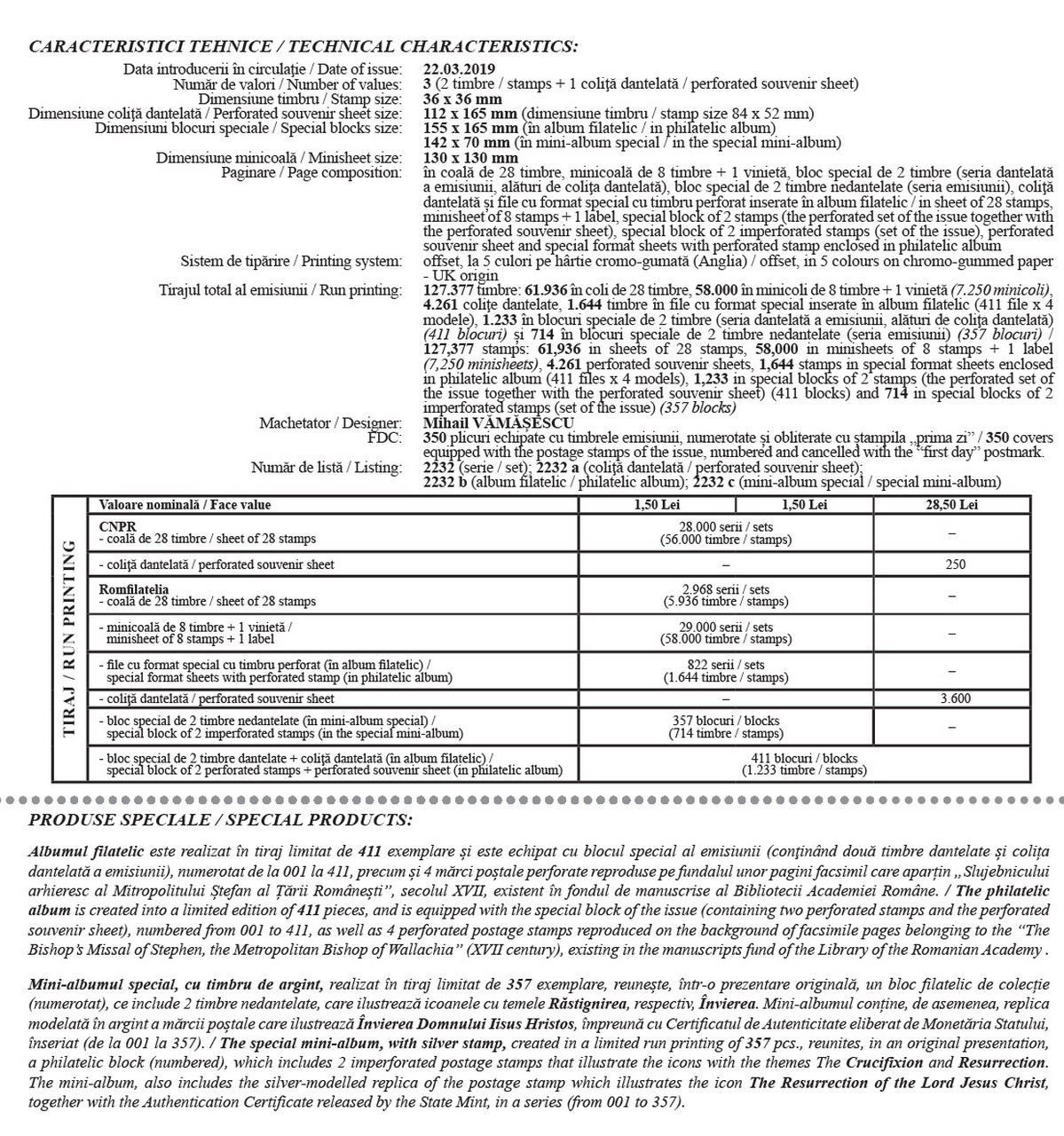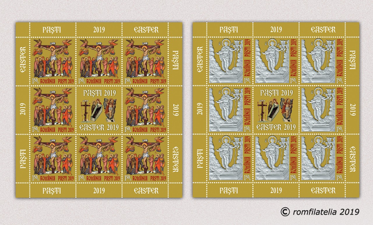 Emisiunea tematică Sfintele Paști 2019 este compusă din două mărci poștale cu valoarea nominală de 1,50 lei fiecare și o coliță dantelată a cărei marcă poștală are valoarea nominală de 28,50 lei.