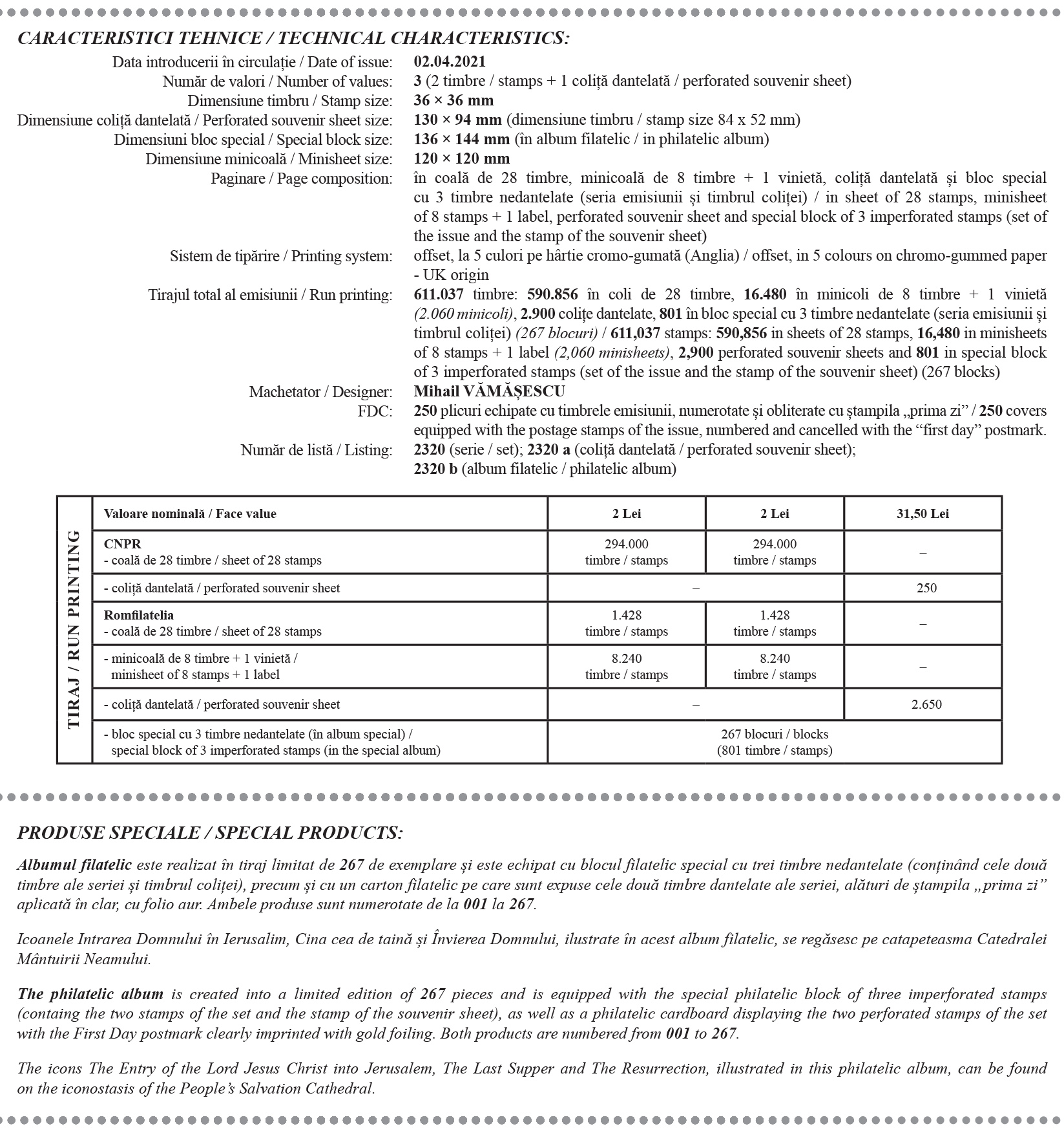 În apropierea celui mai important eveniment al creștinătății, Romfilatelia introduce în circulație vineri, 2 aprilie a.c., emisiunea de mărci poștale Sfintele Paști 2021, care comemorează momente cruciale din viața lui Iisus Hristos – Intrarea în Ierusalim, Cina cea de taină și Învierea.