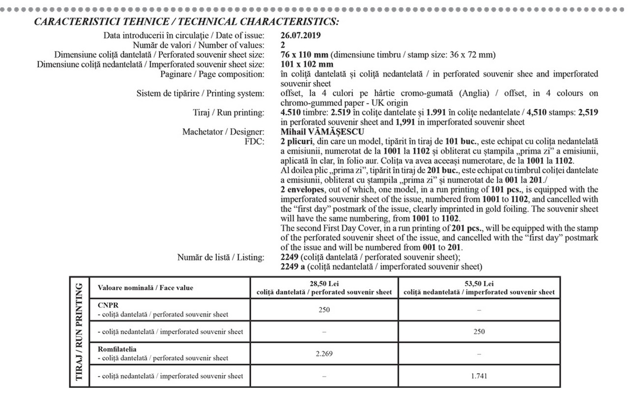 Pe timbrul coliței dantelate este reprodusă imaginea Simonei Halep ridicând trofeul de la Wimbledon 2019. Colița nedantelată, numerotată, prezintă semnătura în folio aur a Simonei Halep și o ilustrează în prim plan în timp ce prezintă publicului trofeul. În timbrul coliței nedantelate este redată o imagine de joc.