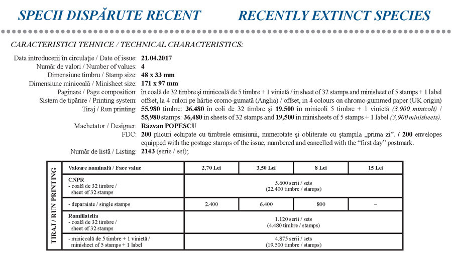 Romfilatelia, prin emisiunea Specii dispărute recent, doreşte să tragă un semnal de alarmă în privinţa schimbărilor climatice ce implică întreaga omenire şi care este responsabilă pentru protejarea planetei.