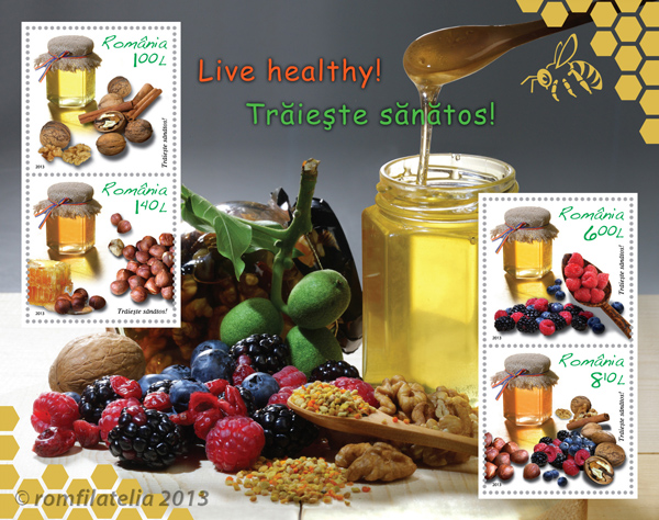 Romfilatelia introduce în circulaţie emisiunea Trăieşte sănătos!, adăugând la tematica iniţiată în anul 2012 o nouă serie de mărci poştale ale căror imagini ilustrează sugestiv resursele naturale care ar trebui să stea la baza unei alimentaţii sănătoase, cum ar fi: mierea, nucile, alunele, fructele de pădure (zmeura, afinele şi murele) şi scorţişoara.